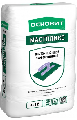 Клей ОСНОВИТ МАСТПЛИКС AC12 эффективный предназначен для высокоэффективной облицовки стен и полов керамической плиткой, керамогранитом, искусственным и натуральным камнем (вес до 600 г/100 см²). Рекомендуется для облицовки балконов, террас, полов с подогревом, цоколей, фасадов. Обладает повышенной пластичностью. Для внутренних и наружных работ.